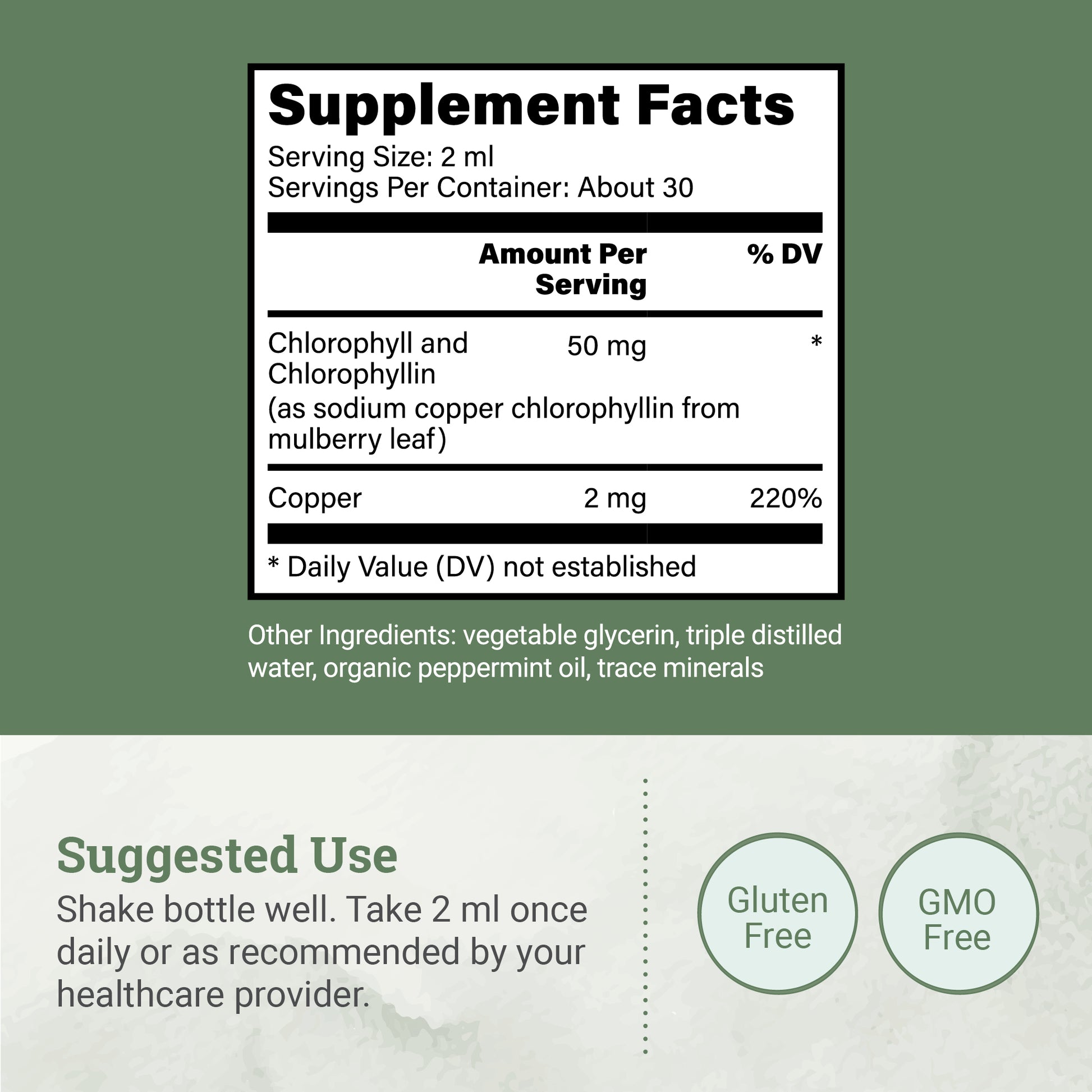 Our cold extraction process using vegetable glycerin instead of alcohol preserves the integrity of the chlorophyll we pull from premium-quality mulberry leaves. We incorporate the green elixir into triple-distilled water with trace minerals, pure peppermint oil, and chlorophyllin – a water-soluble form of chlorophyll that contains copper and sodium to further enhance bioavailability.